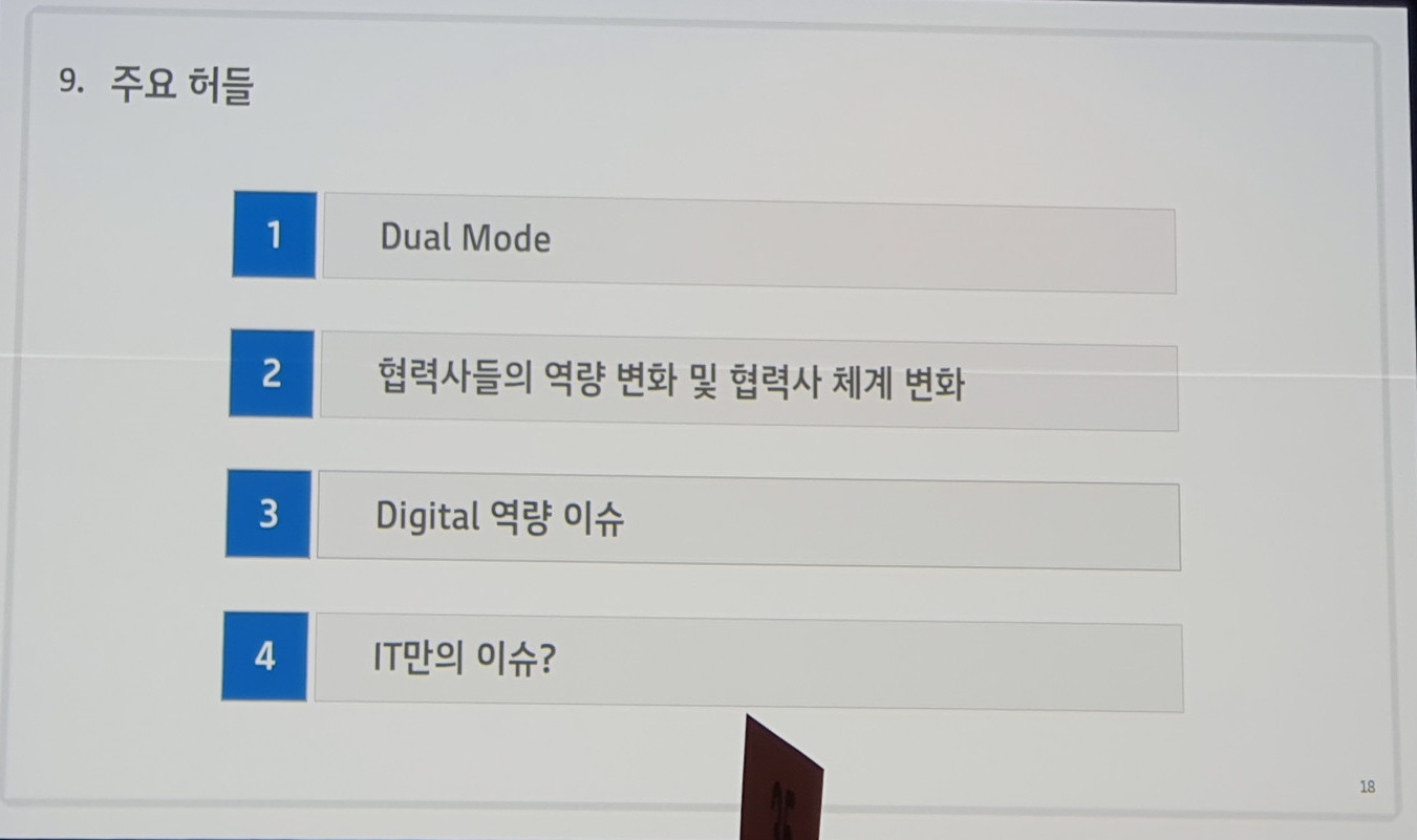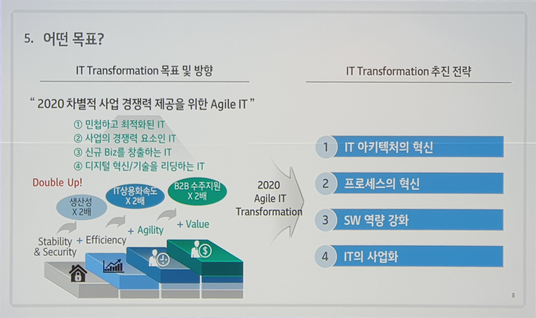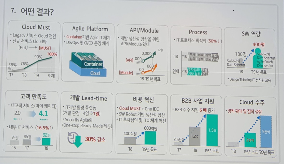 그럼에도 불구하고 KT는 직원들의 교육을 전폭적으로 지원하면서 패러다임 변화에 승선하기 위해 다분히 노력했습니다. 또한 끈임없는 세미나를 통해 직원들의 역량을 키우고 변화의 방향을 다져가면서 성공적인 Transformation을 이루어내고 있다고 합니다.