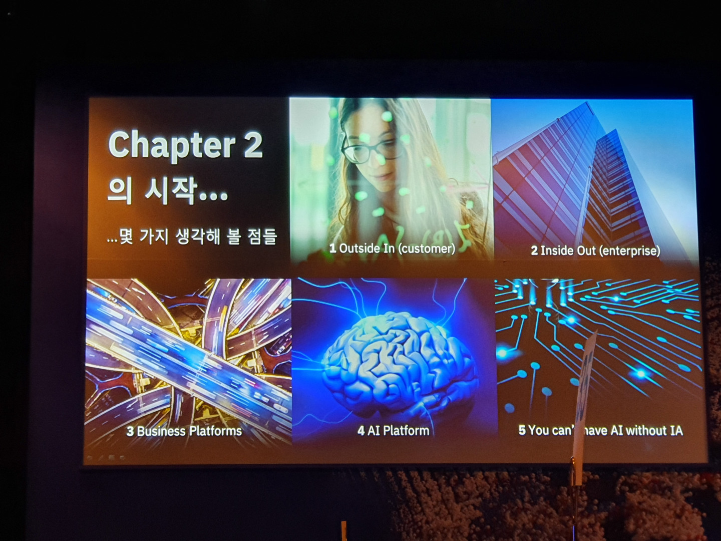 이와 함께 Cognitive Enterprise 비즈니스 모델을 도입한 여러가지 사례를 언급하면서 IBM의 Digital Reinvention의 방향으로 (1) Digital과 AI를 비즈니스에 내재화하고 확산시켜 나가는 과정이며, 이는 Hybrid Cloud와 Mission Critical Application으로 옮겨가는 것부터 시작되며, (2) Cognitive Enterprise와 AI는 기업 혁신의 성공을 위한 청사진이고 (3) Garages, Design Thinking, Agile methods, Minimum Viable Product(MVP)를 통해 가치 실현의 시간을 단축할 수 있다고 하였습니다. 결국 혁신을 위해서는 "IBM의 혁신적인 서비스를 쓰면 됩니다!"를 말하고 싶었던 것 같기도 하네요^^