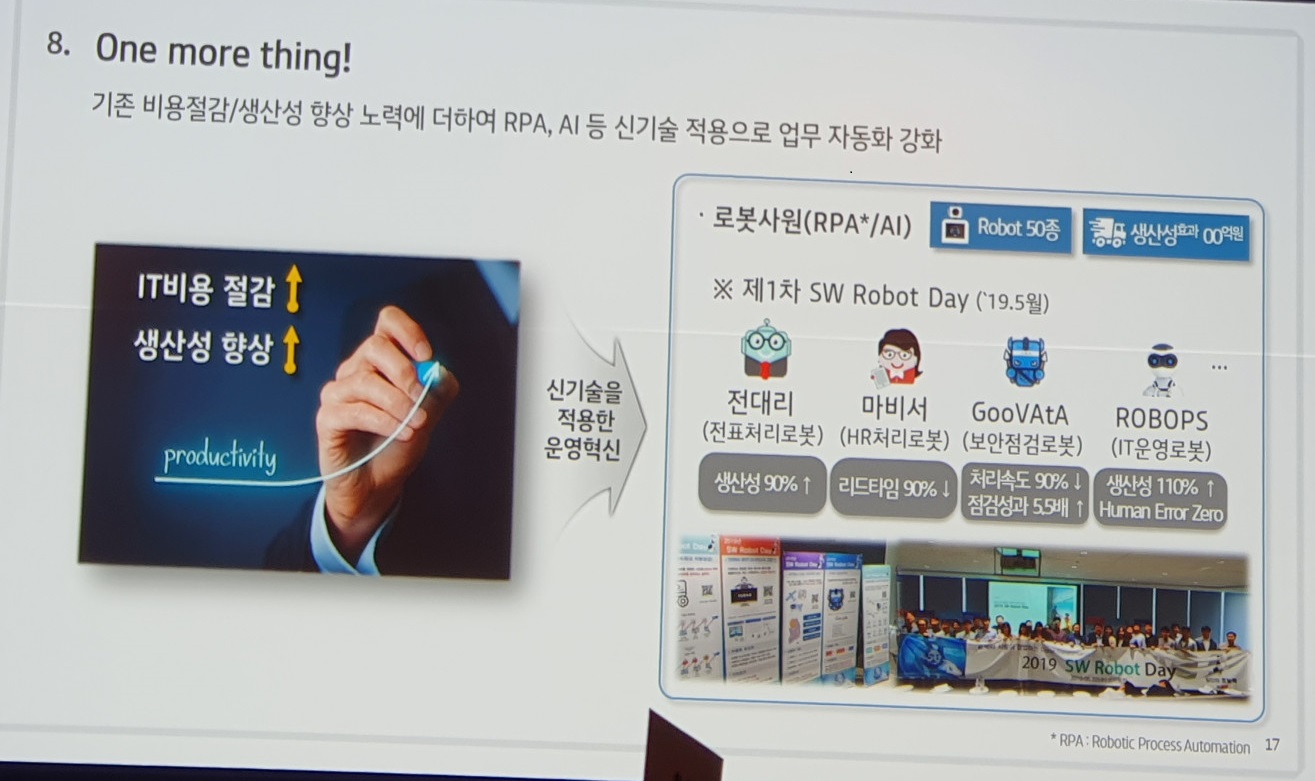 KT도 IBM과 마찬가지로 로봇사원을 적극적으로 도입하여 비용 절감과 생산성 향상을 도모하고 있다고 합니다. 이러다가 일자리가 상당히 없어지는 것 아닌지 모르겠습니다만 사람이 고부가가치의 업무에 집중할 수 있게 되면서 더 많은 일자리가 생기지 않을까 합니다. 물론 이를 위해서는 교육 혁신이 변화의 흐름을 따라갈 수 있어야겠지만요.