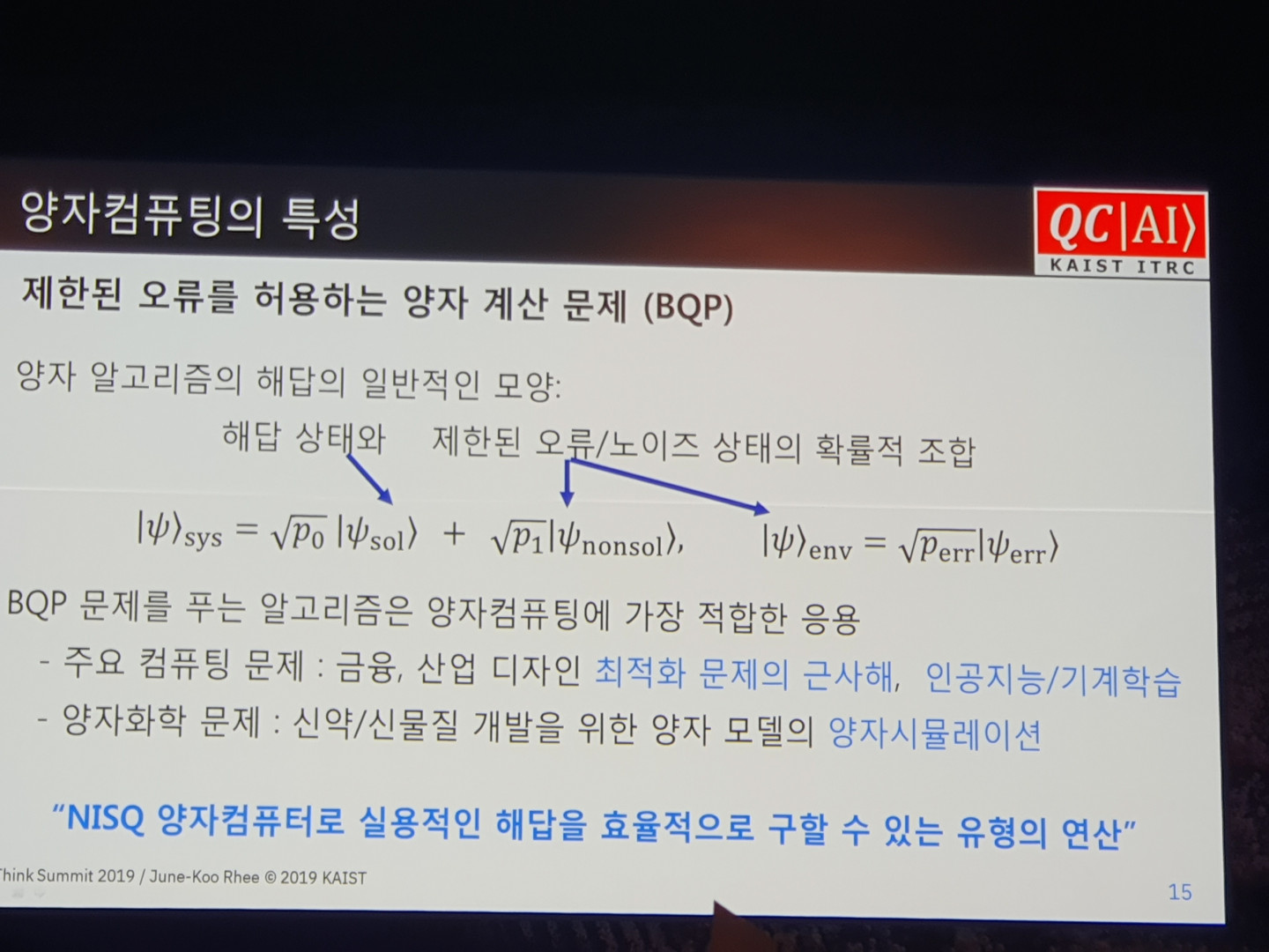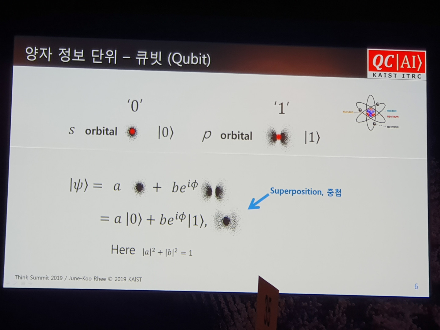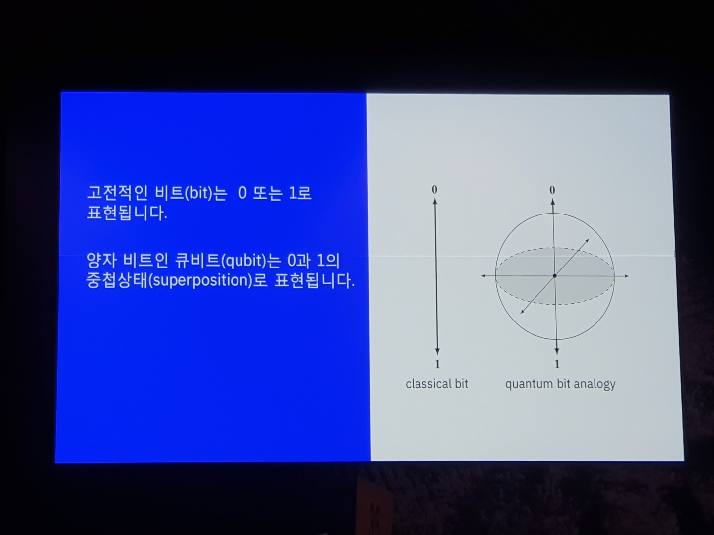잠시 KAIST의 이준구 교수님 발표 자료를 살펴보겠습니다. 기존 컴퓨터 시스템의 0과 1이 보이는데요, 수리물리학적으로 표현해보면 하나의 상태에 중첩이 표현됨을 알 수가 있습니다. 그렇기 때문에 양자 시스템의 한 단위는 기존 시스템보다 더 많은 "정보"를 담을 수 있게 된 것입니다.