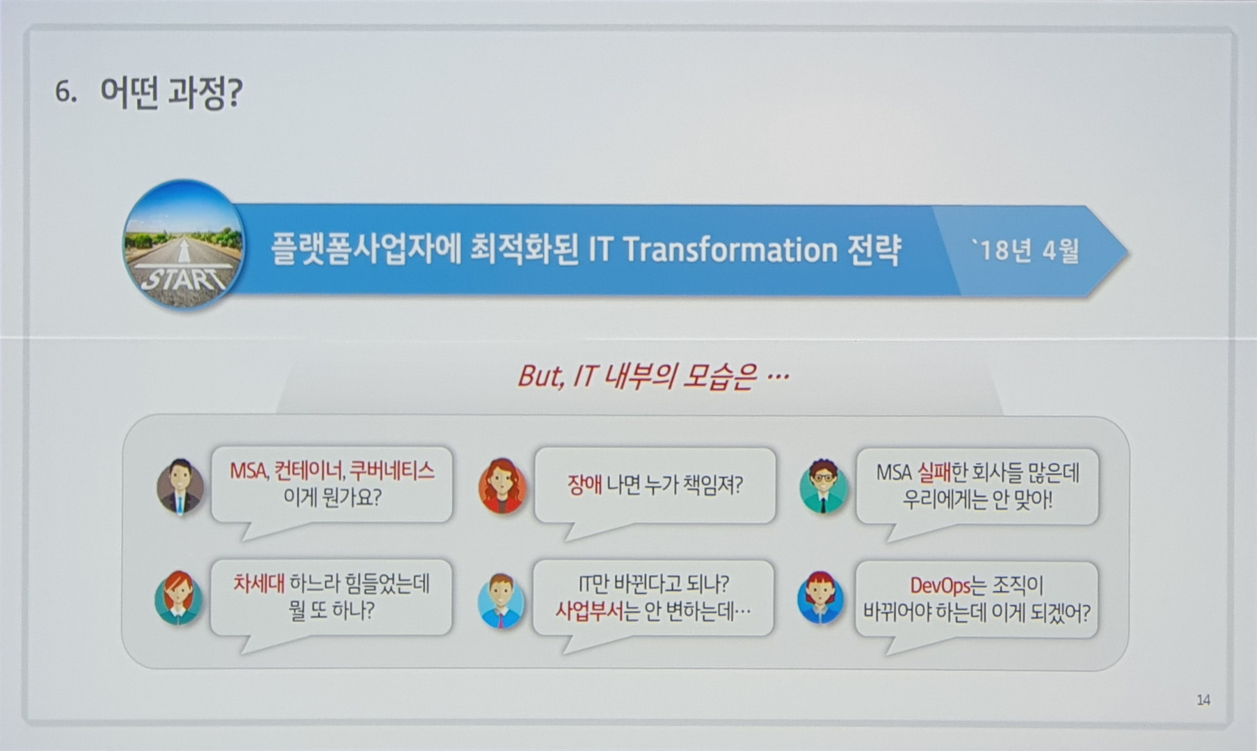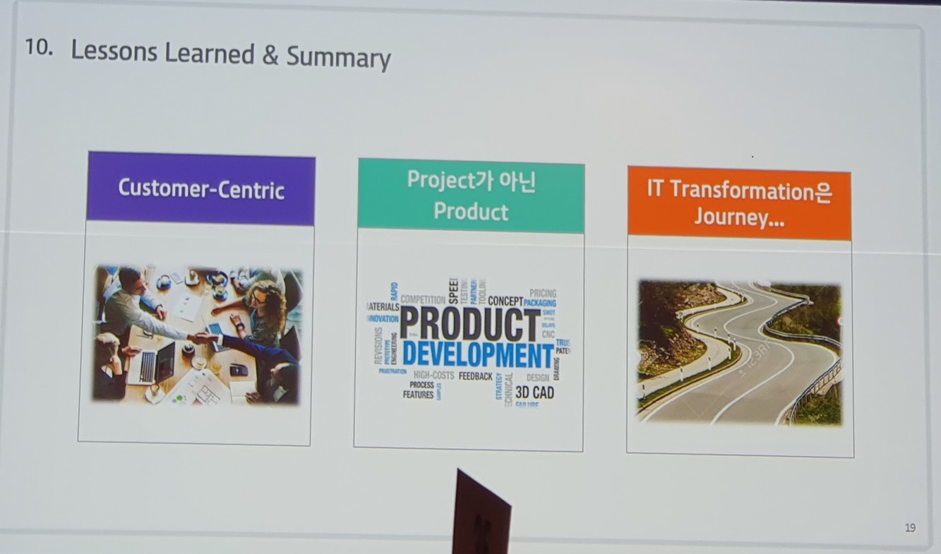 대부분의 IT기업들의 목표는 아직까지도 "시스템을 성공적으로 오픈"하는 것이 KPI였다고 합니다. 마치 대학에 가면 인생이 끝난다고 생각하는 고등학생처럼 눈앞에 보이는 목표를 이루는데 급급했다는 것이죠. 그러고서는 금새 매너리즘에 빠져 더이상의 발전이 없었습니다. 하지만 요즘에는 시스템을 오픈한 뒤에 고객을 분석하고 지속적으로 개선해나가는 등 시스템 오픈은 또다른 과제의 시작이라는 점을 강조하였습니다. 직원들이 오랫동안 갖고 있던 이러한 생각을 바꾸는 것이 얼마나 힘들었을까요?