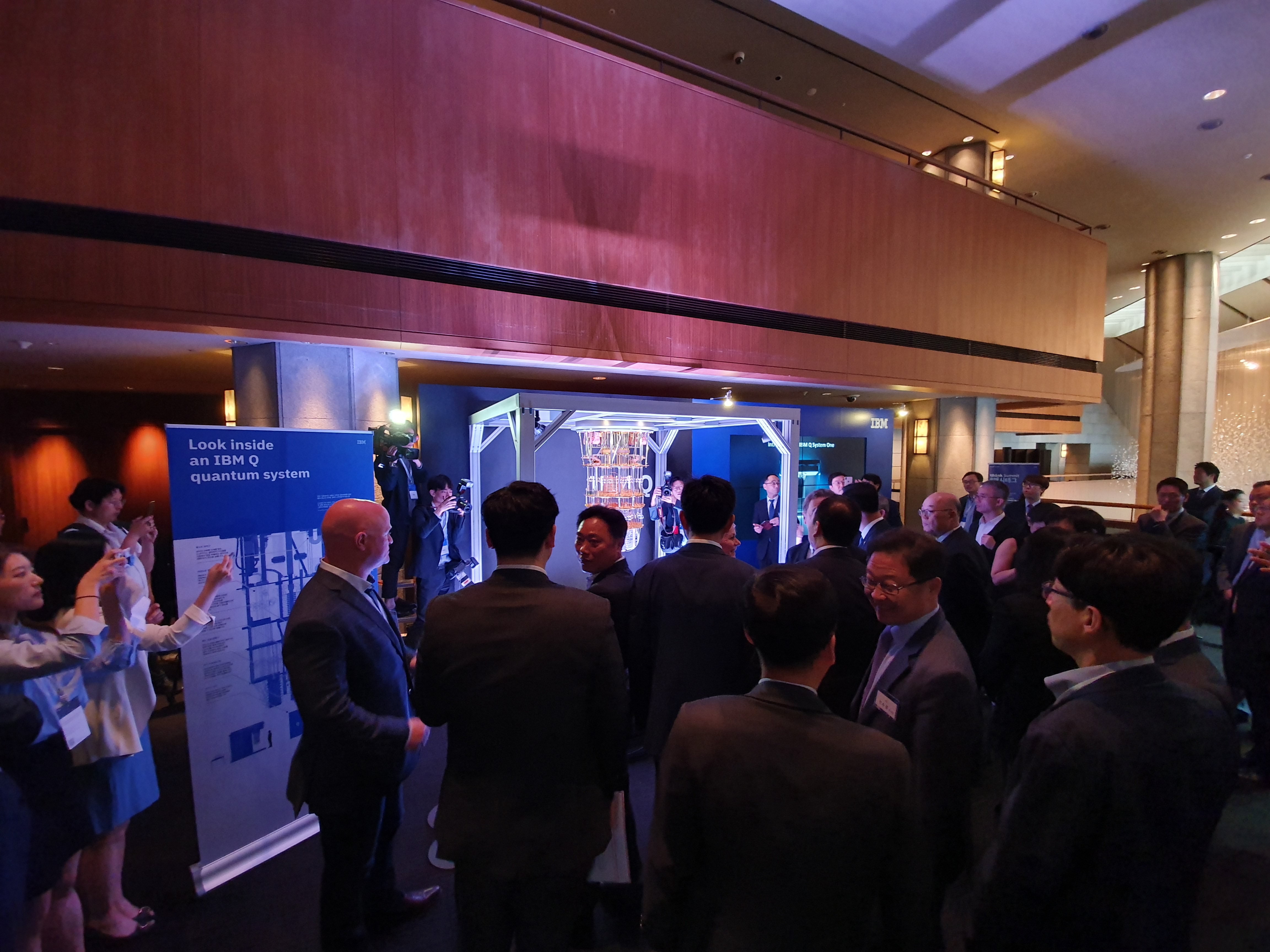 사람들이 모여있던 곳은 IBM의 양자시스템 프로토타입 모형이었습니다. 이번 포럼의 하이라이트이다보니 많은 사람들의 관심을 받고 있었는데요, 이제 막 사람들이 모이고 있어서 가까이에서 사진을 찍을 수가 없었습니다. (ㅜㅜ) 앞에 이번 포럼의 주요 연사이신 Jason Gartner(IBM, Vice President)도 보이네요.