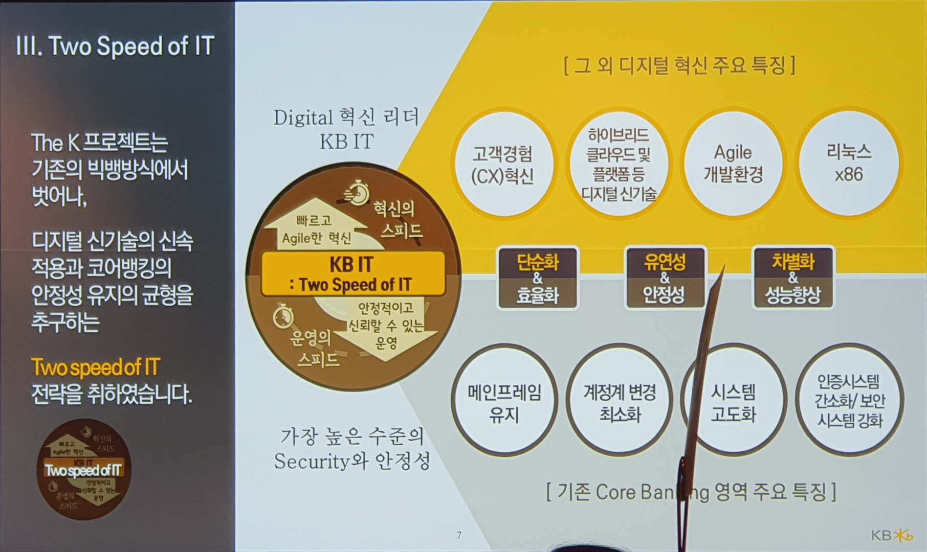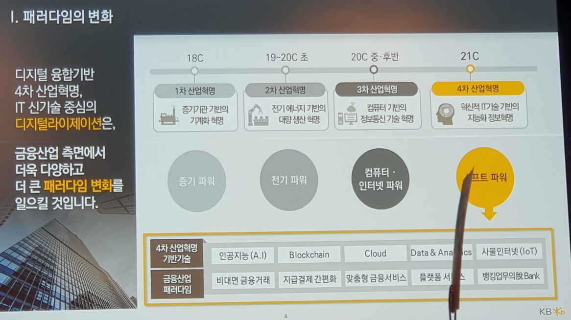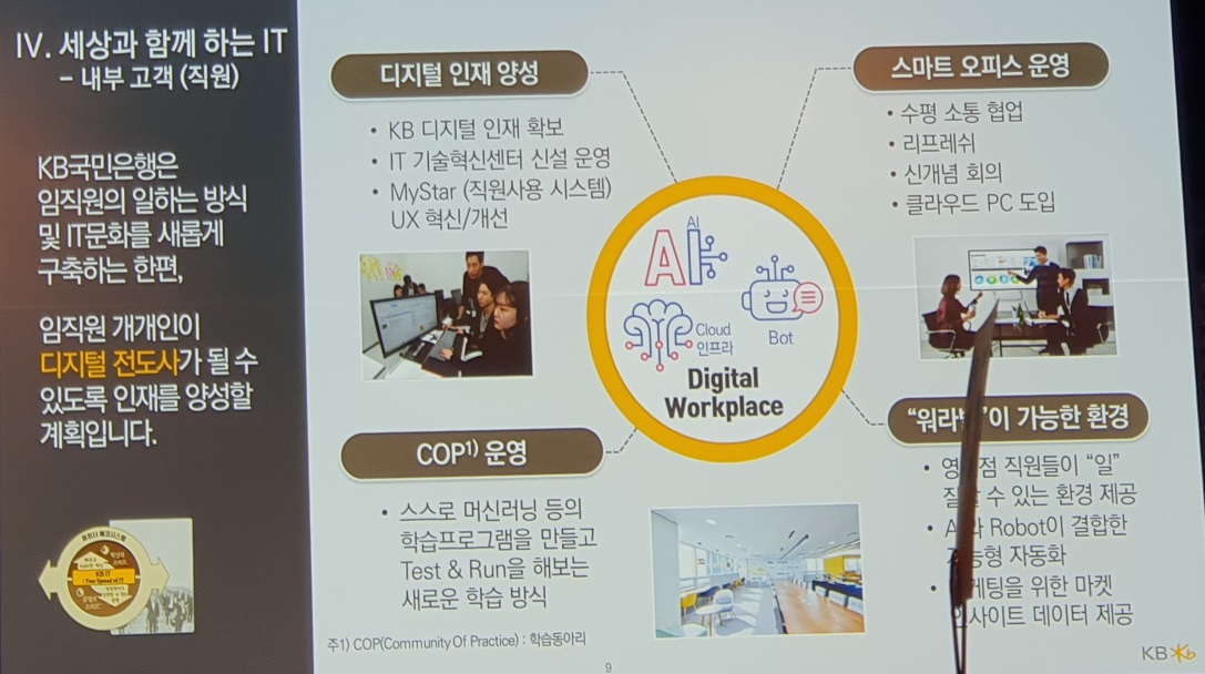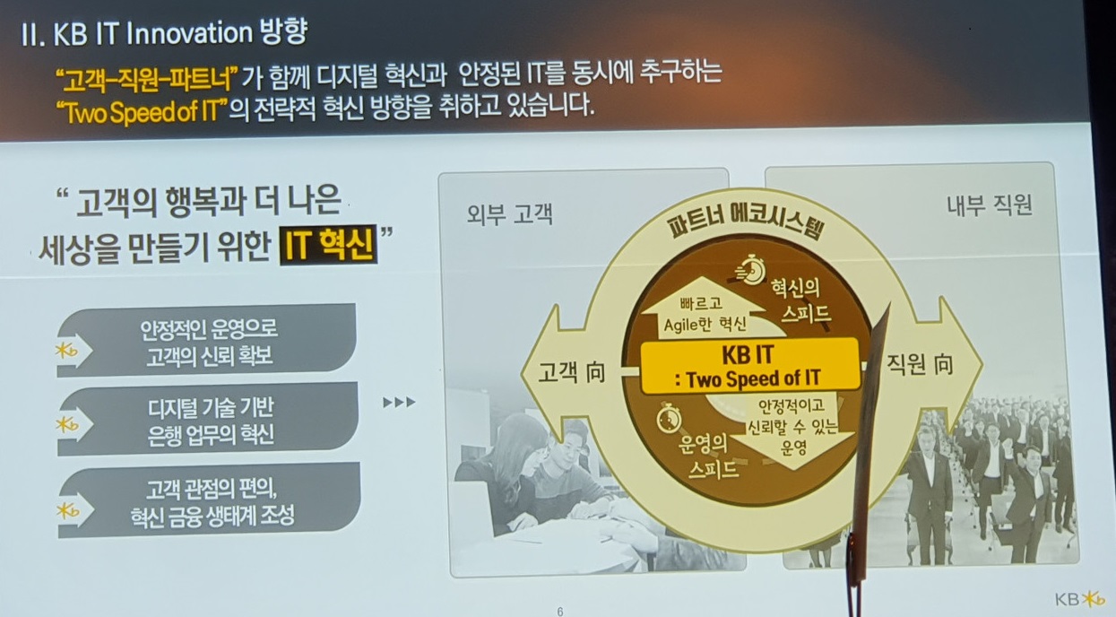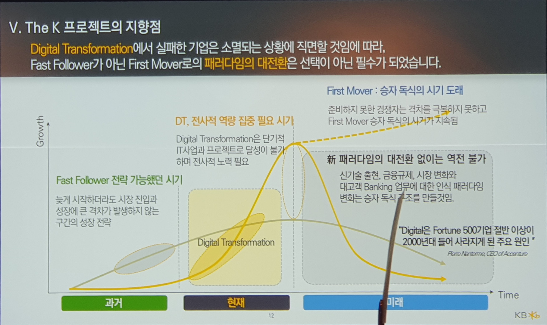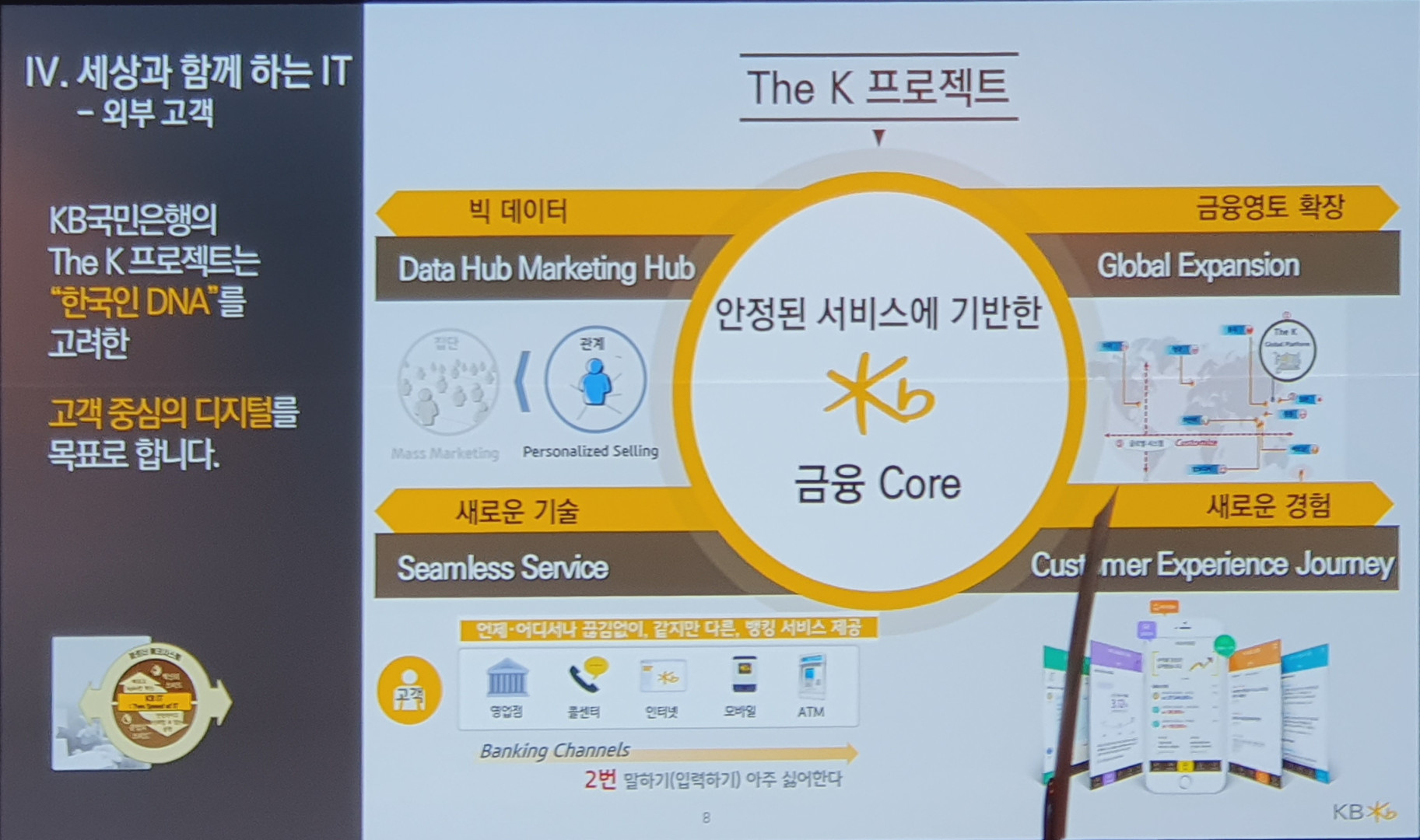 잠시 쉬는 시간을 갖고, 국내 사례인 KT국민은행에 대한 프레젠테이션이 시작되었습니다. KB국민은행이 현재 패러다임의 변화 속에서 어떻게 대처하고 있는지에 대한 이야기였습니다. KT국민은행의 전략은 The K 프로젝트라고 한다네요.