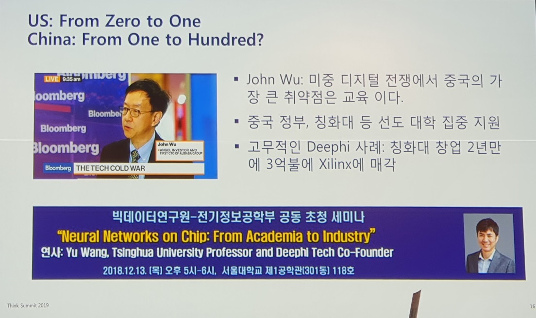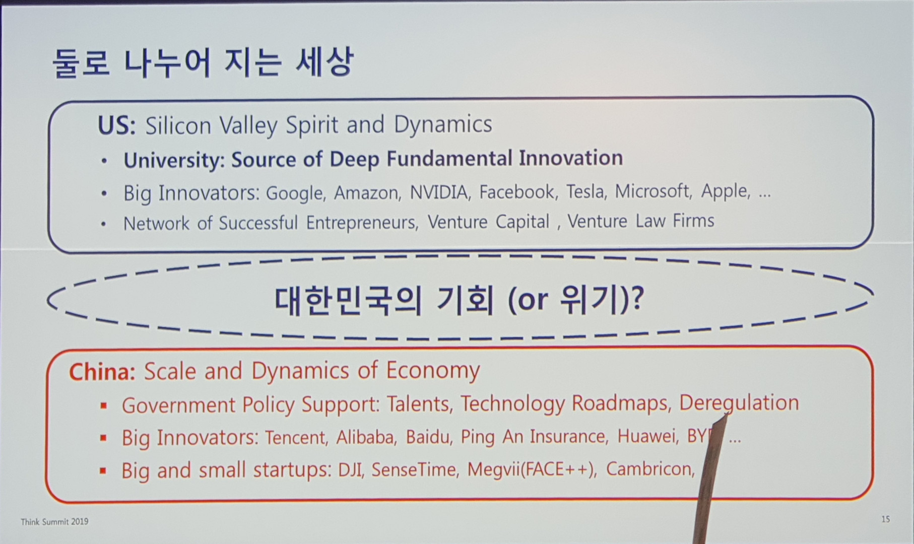 지능 클라우드 서버, 지능 터미널, 지능 로봇을 연구/개발하는 중국과학원 창업 벤처인 Cambricon 사례를 말씀해주셨는데 중국이 교육부터 산업까지 과감한 혁신과 투자, 국가차원의 전폭적인 지원으로 미국 나아가 세계을 위협하고 있다고 하였습니다. 한국 역시도 이러한 패러다임의 변화, 패권 전쟁에서 살아남기 위해서는 정말 퀀텀 점프가 필요한 상황인데 많이 부족하다고 합니다.