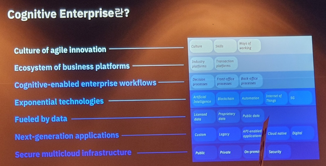 나아가 Cognitive Enterprise라는 개념을 소개하면서 Enabled Professionals, Process & Workflow, Internal/External Data에 기반을 둔 Business platform이 필요하다고 재차 강조하였습니다.