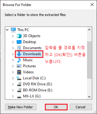 압축을 풀 경로를 지정하는데 저는 [다운로드] 폴더를 지정하고 [OK(확인)] 버튼을 눌렀습니다.