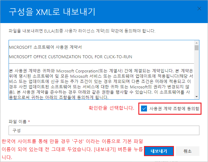 '사용권 계약 조항에 동의함'에 선택하고, [내보내기] 버튼을 누르면 구성.xml 파일이 내보내집니다.