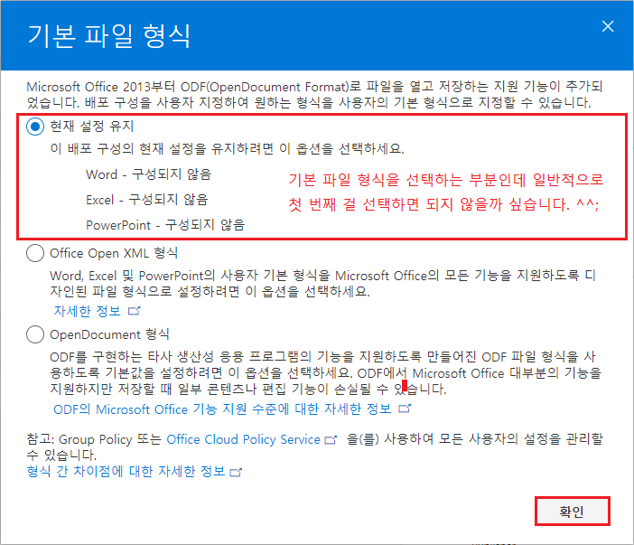 읽어봐도 어려운 내용인데 굳이 세 번째의 OpenDocument 형식으로 설정할 필요는 없는 거 같고, 현재 설정 유지냐 Office Open XML 형식이냐 고민 많이 했습니다. ㅠㅠ 근데 걍 첫 번째로 골랐습니다.