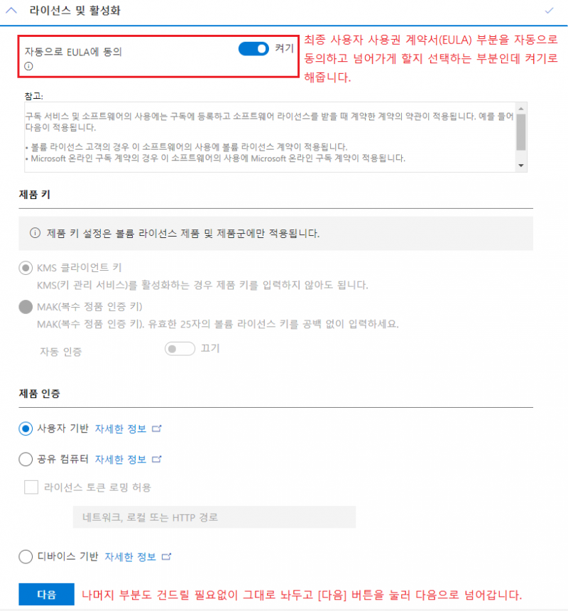 라이선스 및 활성화 부분입니다. 최종 사용자 사용권 계약서(EULA)만 자동으로 동의되고 넘어가게 켜기로 해줍니다.