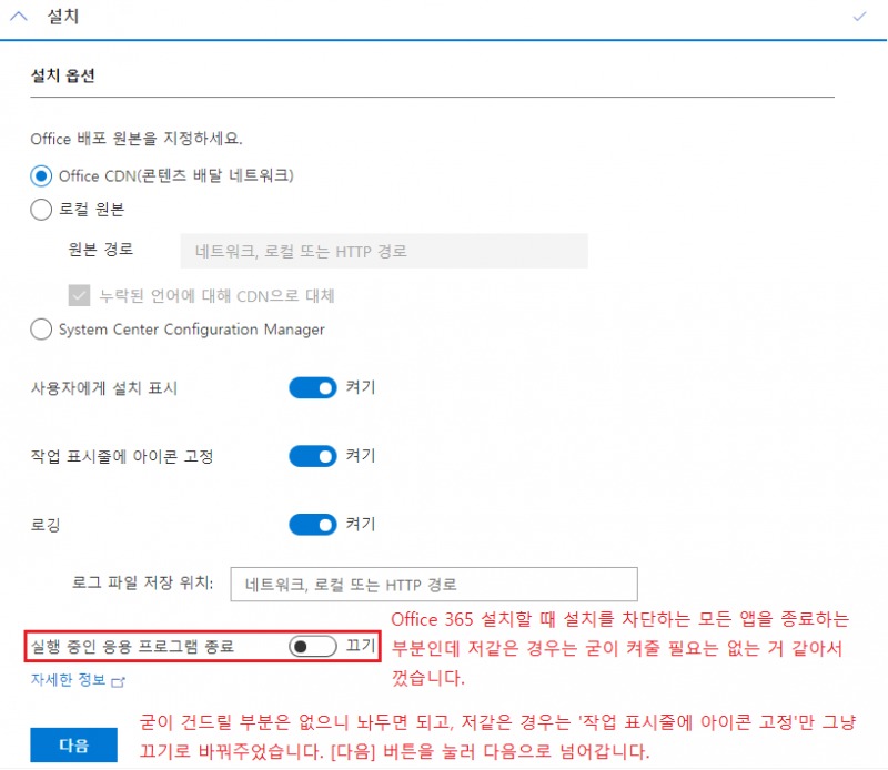 한두번 해보면 간단하다는 걸 알 수가 있고, 설치 파일은 미리 받아두는 것 보단 Office 365를 설치할 때 받아두는 게 좋습니다.