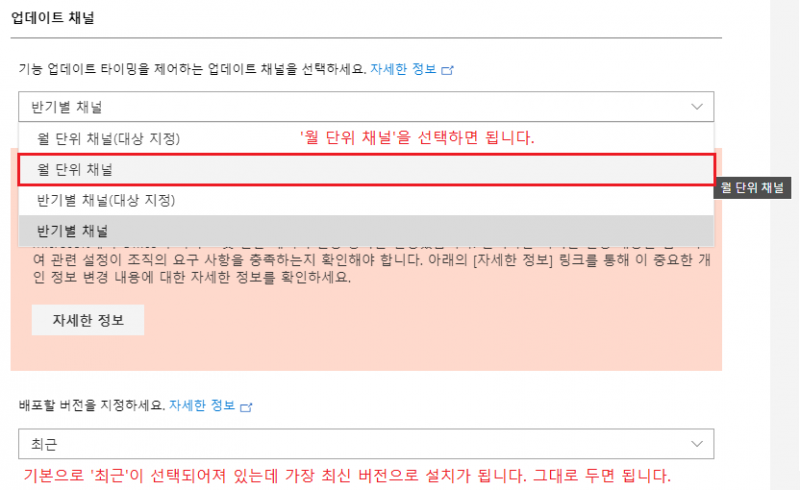 업데이트를 월 단위로 받을 거냐 반기별로 받을 거냐 고르는 부분인데 일반적으로 '월 단위 채널'을 선택해서 월 단위로 업데이트를 제공받게 하면 됩니다.