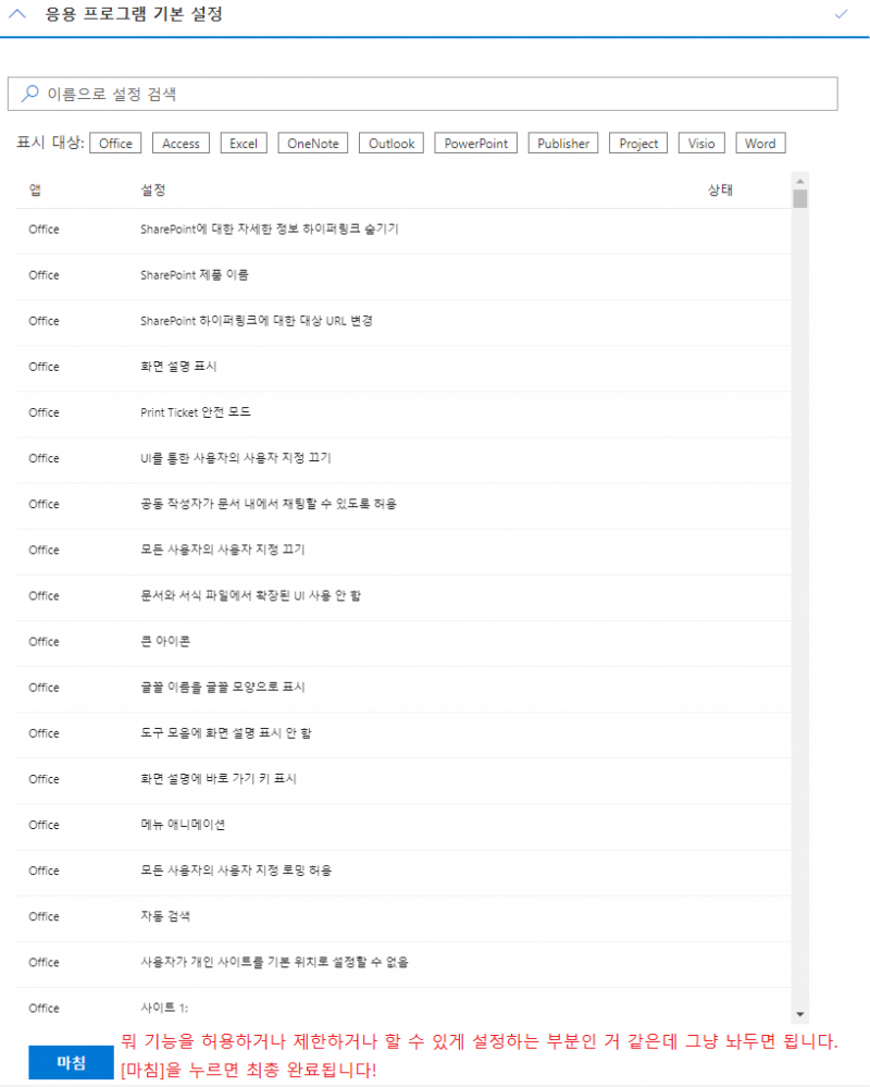 응용 프로그램 기본 설정 화면입니다. 넘어가면 되며 [마침] 버튼을 누르면 모든 구성이 완료됩니다.