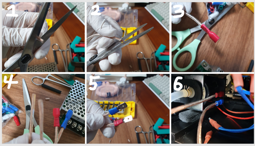 위 그림에서 1번->2번처럼 피복을 벗겨내고, 3번, 4번, 5번처럼 터미널을 꼽고, 케이블을 넣은 부분을 니퍼 등으로 강하게 조여주면 됩니다.