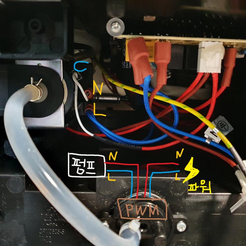 전체적으로 정리할 때 전원 -> PWM으로 가는 케이블에 달린 하얀 콘덴서를 그림 11처럼 원래 위치에 넣어주면 정리가 나름 깔끔해집니다.