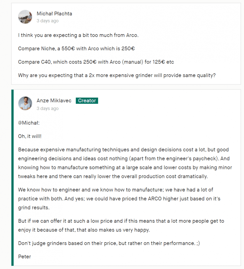 그라인더는 핸드밀에 전동킷이 포함된 상품인데요, 펀딩 자체는 신뢰할만한 곳에서 진행하고 있어 먹튀 위험은 없습니다만 최근 코멘트를 보면 그라인딩 품질에 자신감이 넘쳐 보이네요 ㅎㅎ
